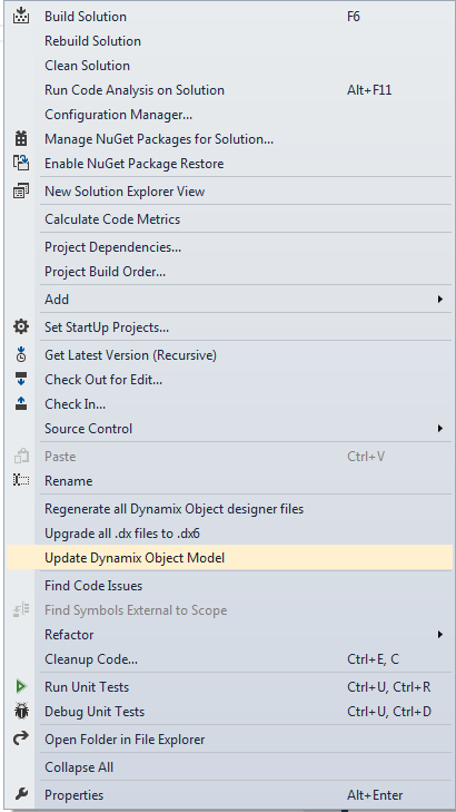 When project compiles, right click solution node and click on "Update Dynamix Object Model"